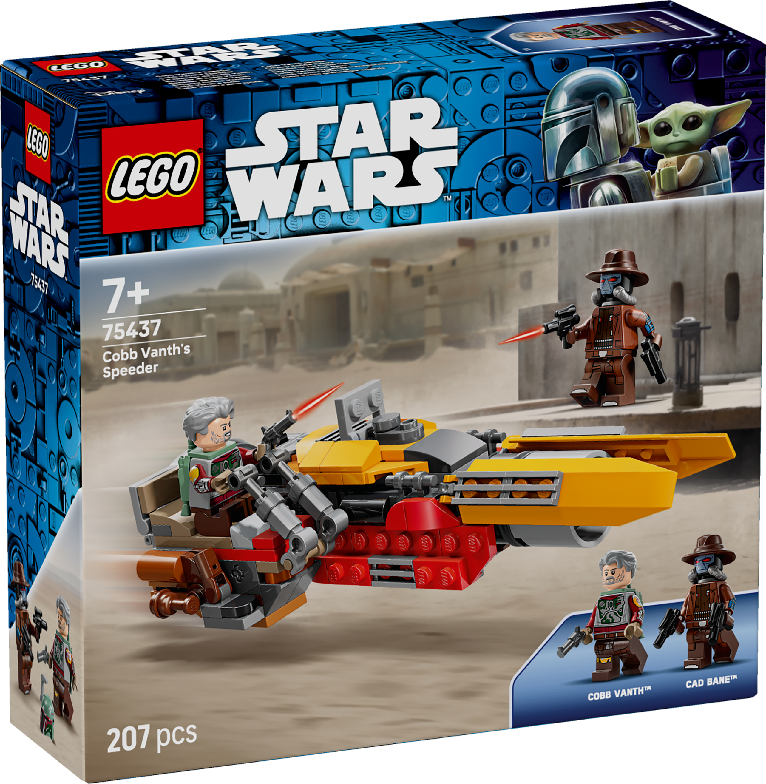 - SPEEDER – Place Cobb Vanth in the driver’s seat of his Star Wars™ vehicle, which features adjustable steering vanes, and clip his blaster pistol to the side of the speeder