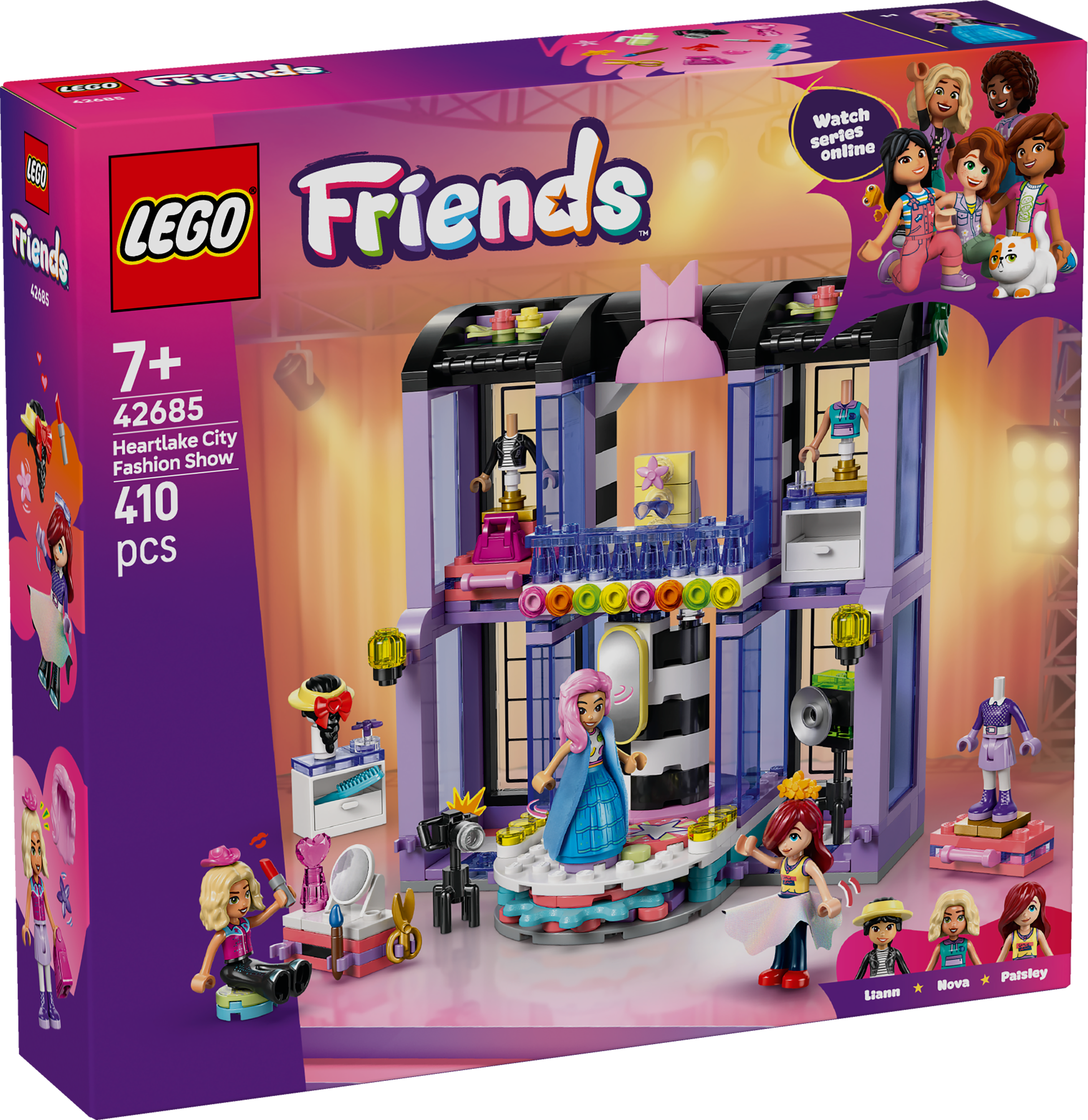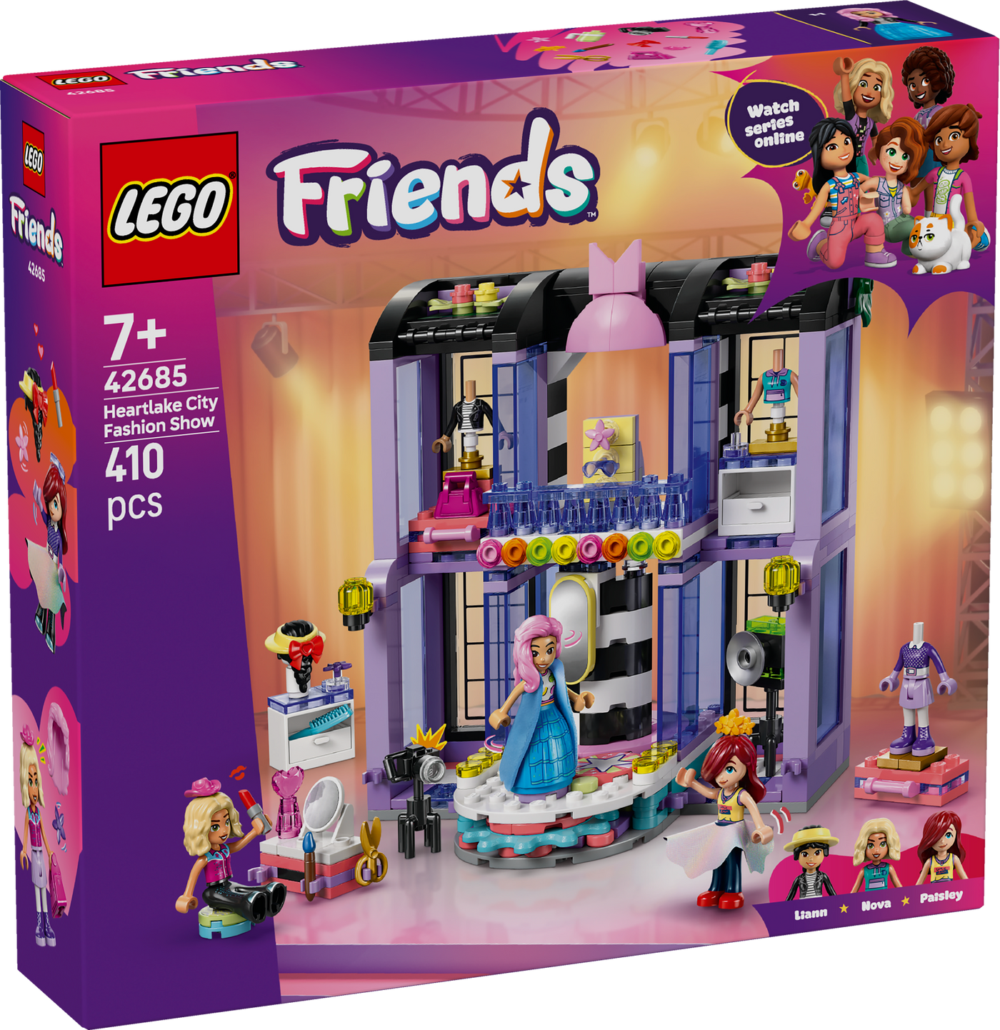 Inspire young fashion designers ages 7 and up to create their own runway magic with the LEGO® Friends Heartlake City Fashion Show (42685). Girls and boys can enjoy endless play as they style outfits, choose accessories and help the characters put on a fashion show. This set is packed with cute details and comes with 3 minidolls and lots of outfits to mix and match, including a skirt, coat, hats, jeans, sunglasses and handbag. After choosing clothes and accessories, kids can place the LEGO Friends characters on the rotating platform, ready for their big reveal before they take to the runway. The set offers lots of creative ways to play with a vanity table, mirrors, cameras and more, to recreate the fun of a real fashion show. This set makes a great gift for girls and boys who love dress up toys and fashion. Kids can enjoy intuitive building with the LEGO Builder app, zooming and rotating with 3D instructions, while tracking progress – all from the app. Set contains 410 pieces.