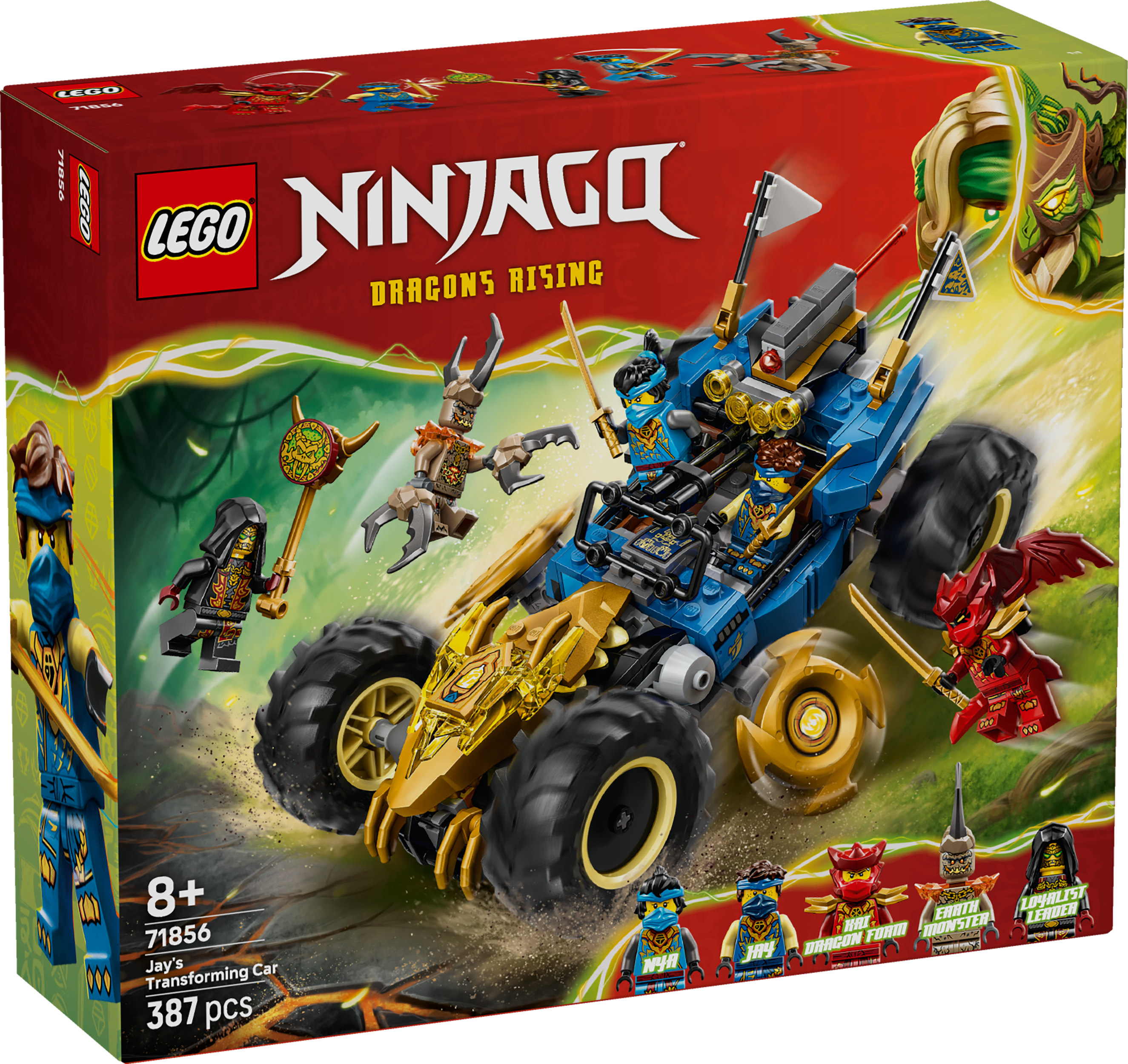 - CAR RACING TOY FOR KIDS – Jay’s Transforming Car (71856) building toy lets boys and girls ages 8 and up play out fast-paced action from season 4 of the NINJAGO® Dragons Rising TV show