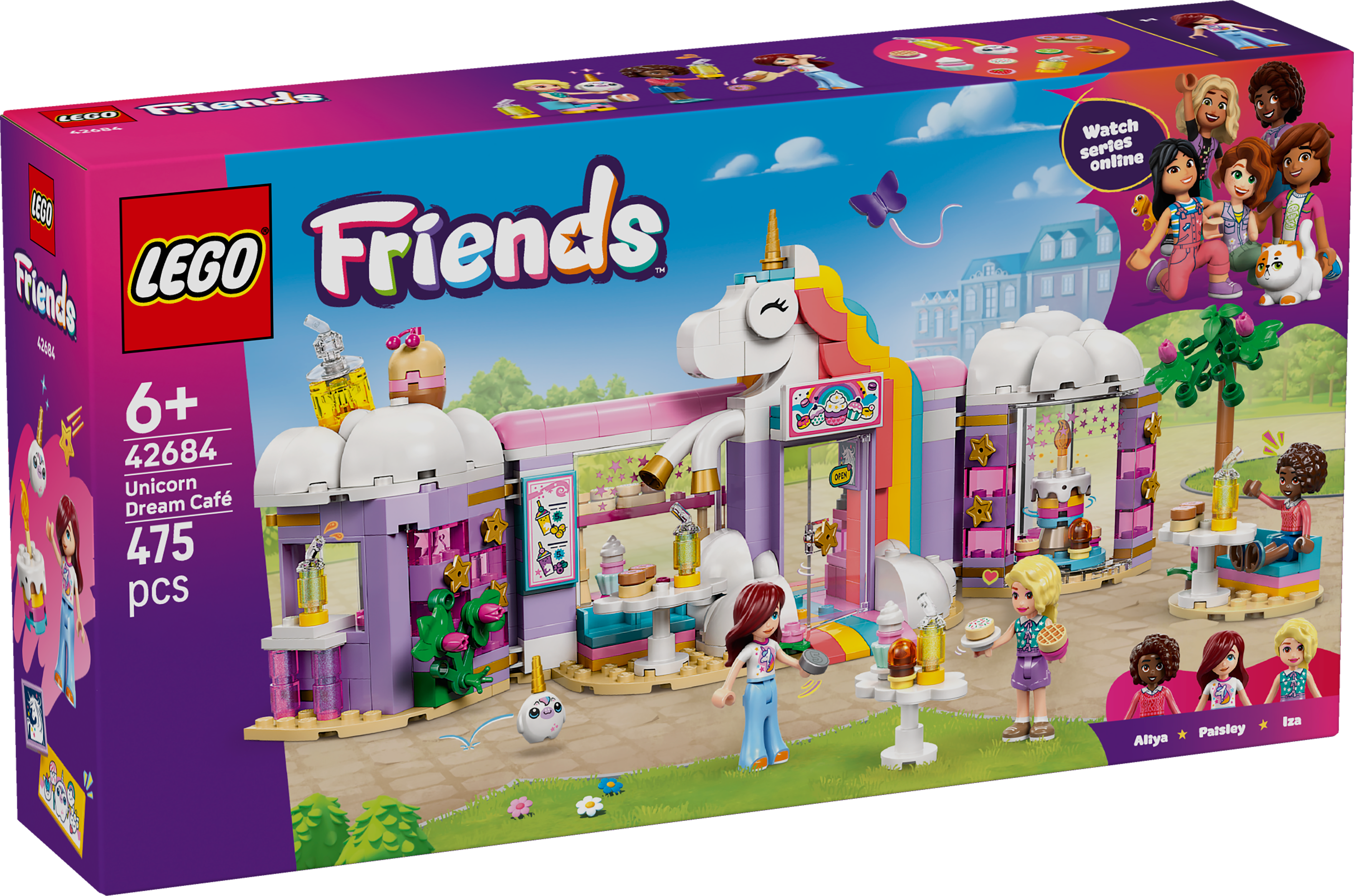- RAINBOW UNICORN CAFÉ PLAYSET – Kids ages 6 and up can play pretend as café owners with this detailed LEGO® Friends Unicorn Dream Café set (42684) including 3 minidolls and toy cakes for imaginative play
