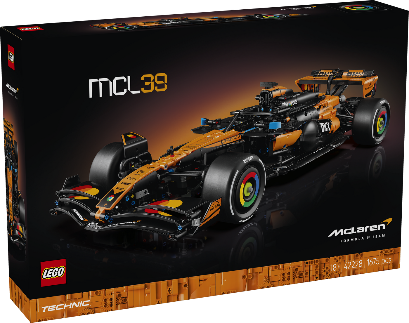 Race to glory with this detailed LEGO® Technic™ McLaren MCL39 F1® Car model kit for adults (42228). This set makes a great gift idea for motorsport fans, offering a challenging and rewarding building experience as you recreate the detailed features of this 1:8 scale F1® car model. Assemble the details of the 2025 McLaren MCL39 F1® car as you build the steering, suspension, gearbox and differential. Activate the DRS, then remove the engine cover to examine the V6 engine. Enjoy your victory lap as you proudly display the model in pole position as a tribute to your passion for F1®. Build your dream garage with the collection of LEGO Technic vehicle sets for adults (each sold separately). Enjoy enhanced building with the LEGO Builder app, zooming and rotating with 3D instructions, while saving and tracking progress – all from the app. Set contains 1,675 pieces.
