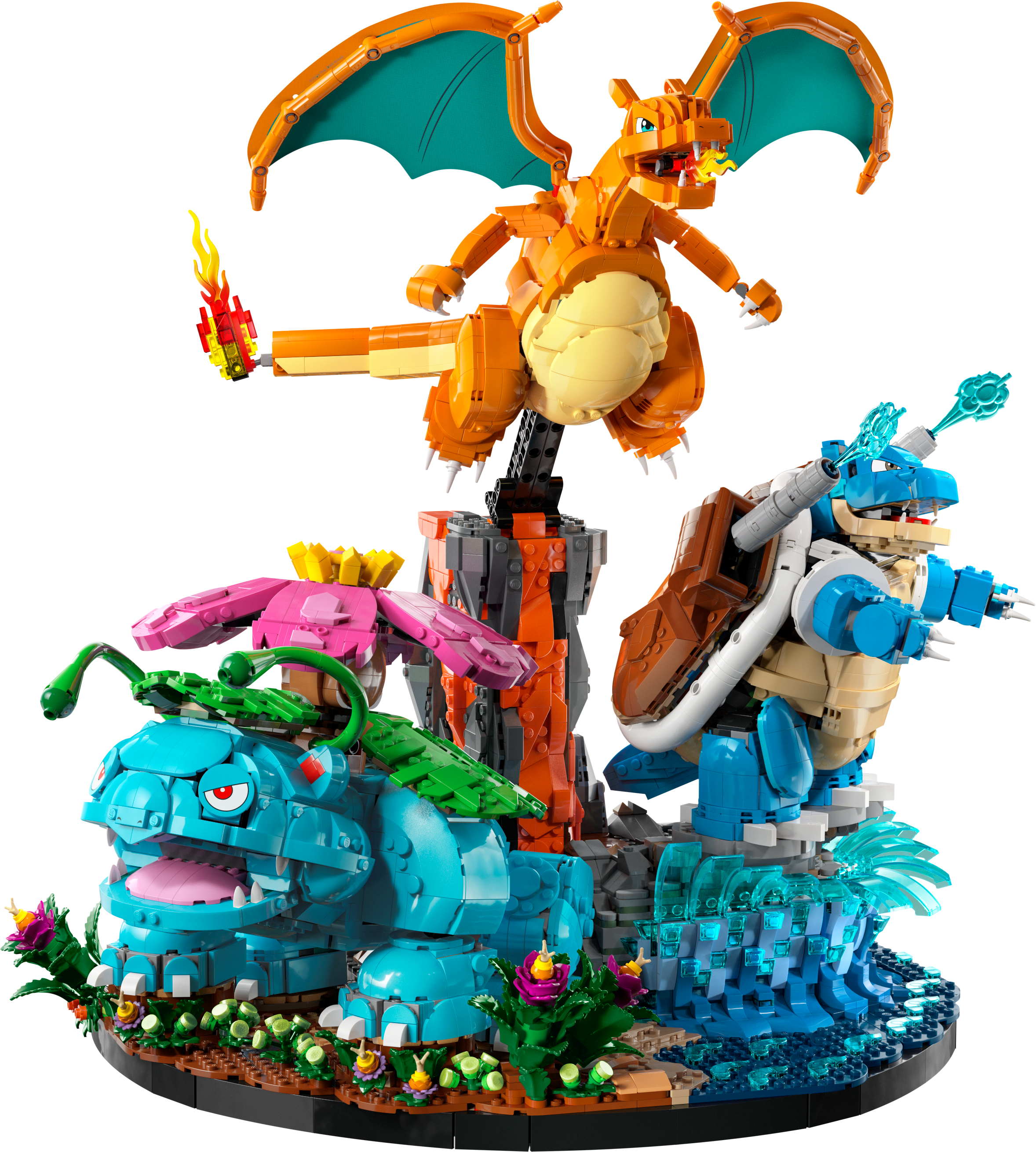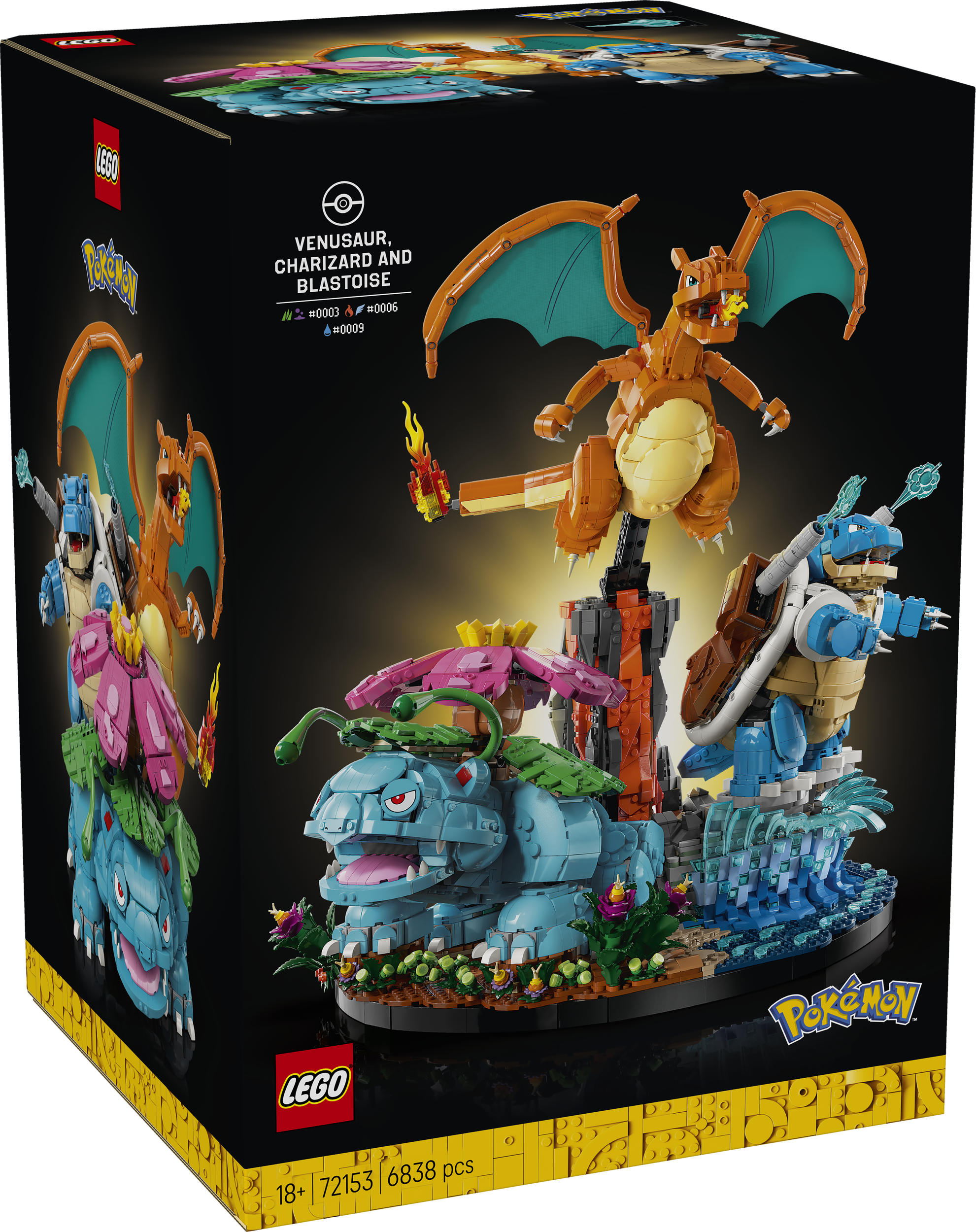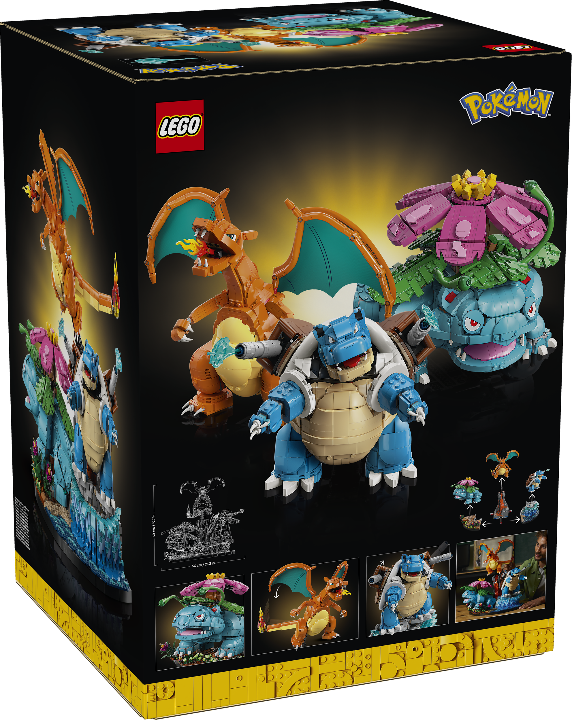 - DIMENSIONS – This 6,838-piece collectable Pokémon building set includes Venusaur, Charizard and Blastoise figures that stand over 23 cm (9 in.), 20 cm (8 in.) and 18 cm (7 in.) tall respectively