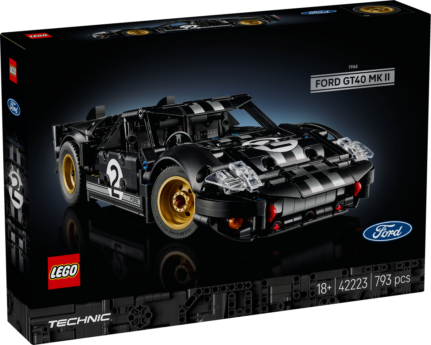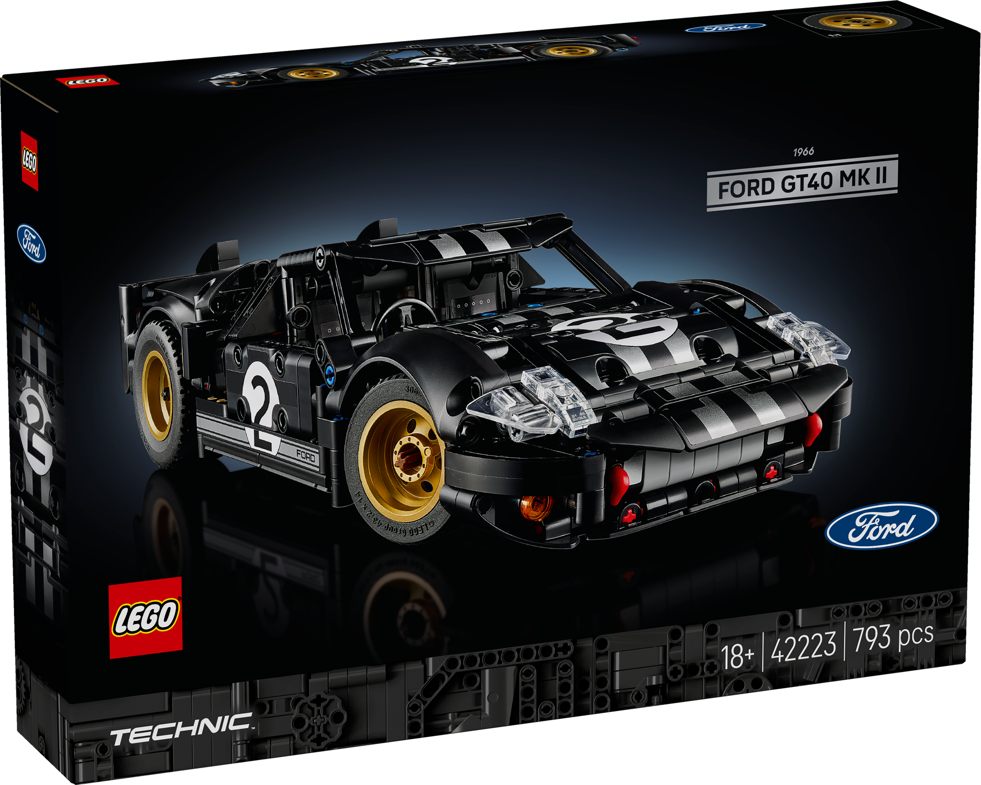 Drive to victory and celebrate a motoring icon with this LEGO® Technic™ 1966 Ford GT40 MKII Race Car model for adults (42223). Car lovers, racing fans and building enthusiasts ages 18+ can invoke the spirit of an iconic endurance race with this realistic model version of an iconic vintage car. Have fun exploring the detailed features of the set. Use the knob on top of the car to steer. Check out the opening doors and admire the black and silver livery that’s inspired by the real-life champion car. Open the engine cover to reveal the V8 engine, then use the lever inside to open the hood. After you’ve built it, you can proudly display your race car in any room or office. Drive your desire for high-performance vehicle building kits with therange of LEGO Technic collectible cars for adults. Enjoy enhanced building with the LEGO Builder app, zooming and rotating with 3D instructions, while saving and tracking progress – all from the app. Set contains 793 pieces.