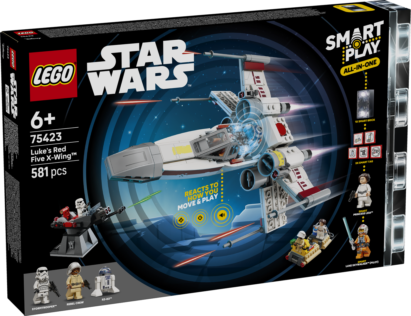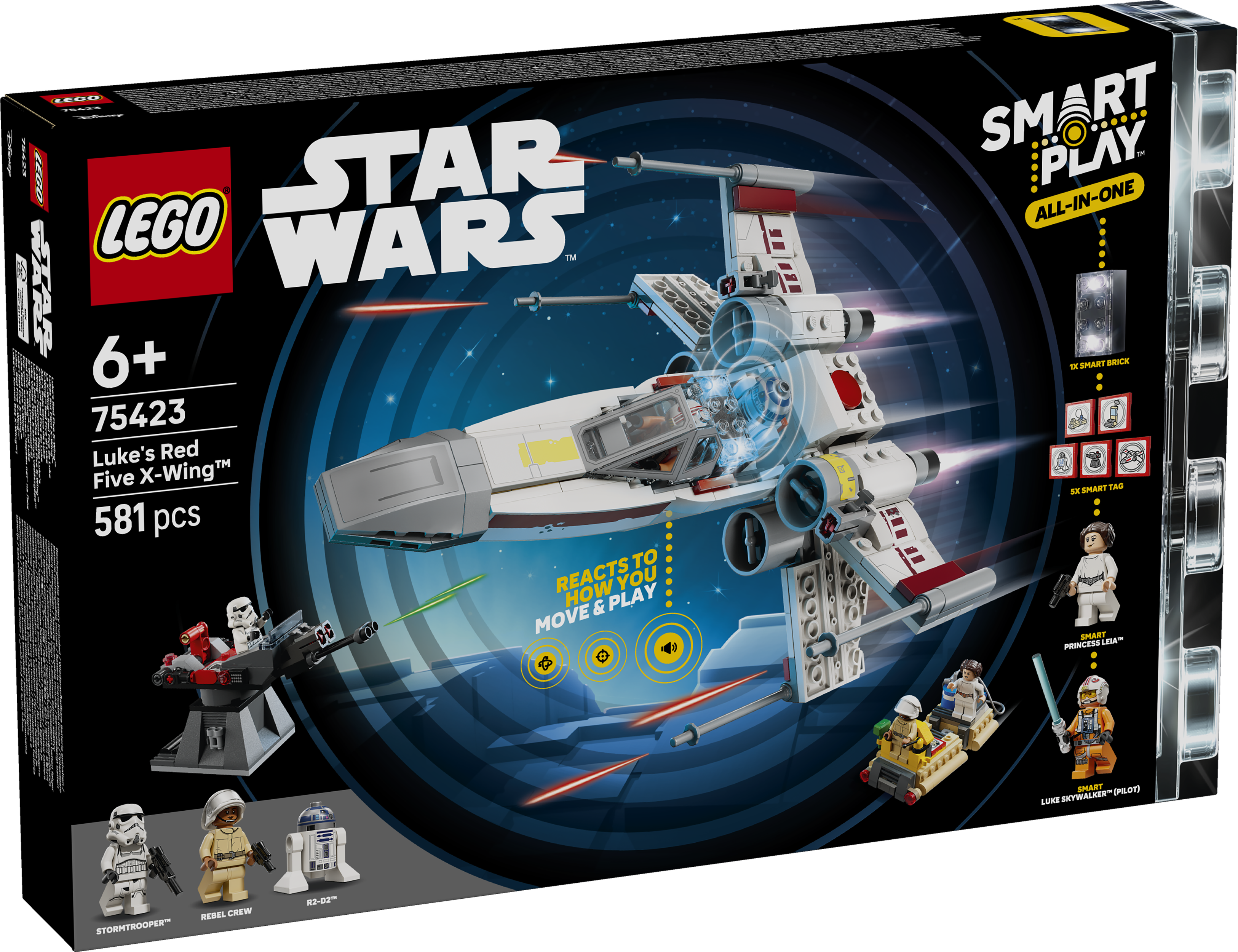 Launch into a thrilling new galaxy of LEGO® Star Wars™ adventures with Luke’s Red Five X-Wing interactive building toy (75423) for kids. Part of a range of sets powered by the LEGO SMART Play™ system, this All-In-One Set includes all SMART Play components – a SMART Brick and charger, 2 LEGO SMART minifigures and 5 SMART Tags – enabling responsive play, dynamic sound and lights and more. Hear the engine’s roar as the X-wing fighter is flown. Activate laser-shooting sounds with the X-wing and Imperial turret. Monitor communications in the command center. Bring SMART Luke Skywalker and SMART Princess Leia to life. Refuel and repair the X-wing with the transporter. Help children get started, troubleshoot, control sound levels and download updates for enhanced SMART Play action with the LEGO SMART Assist App. A top Star Wars gift for kids, boys and girls ages 6 and up, this innovative set contains 581 pieces.