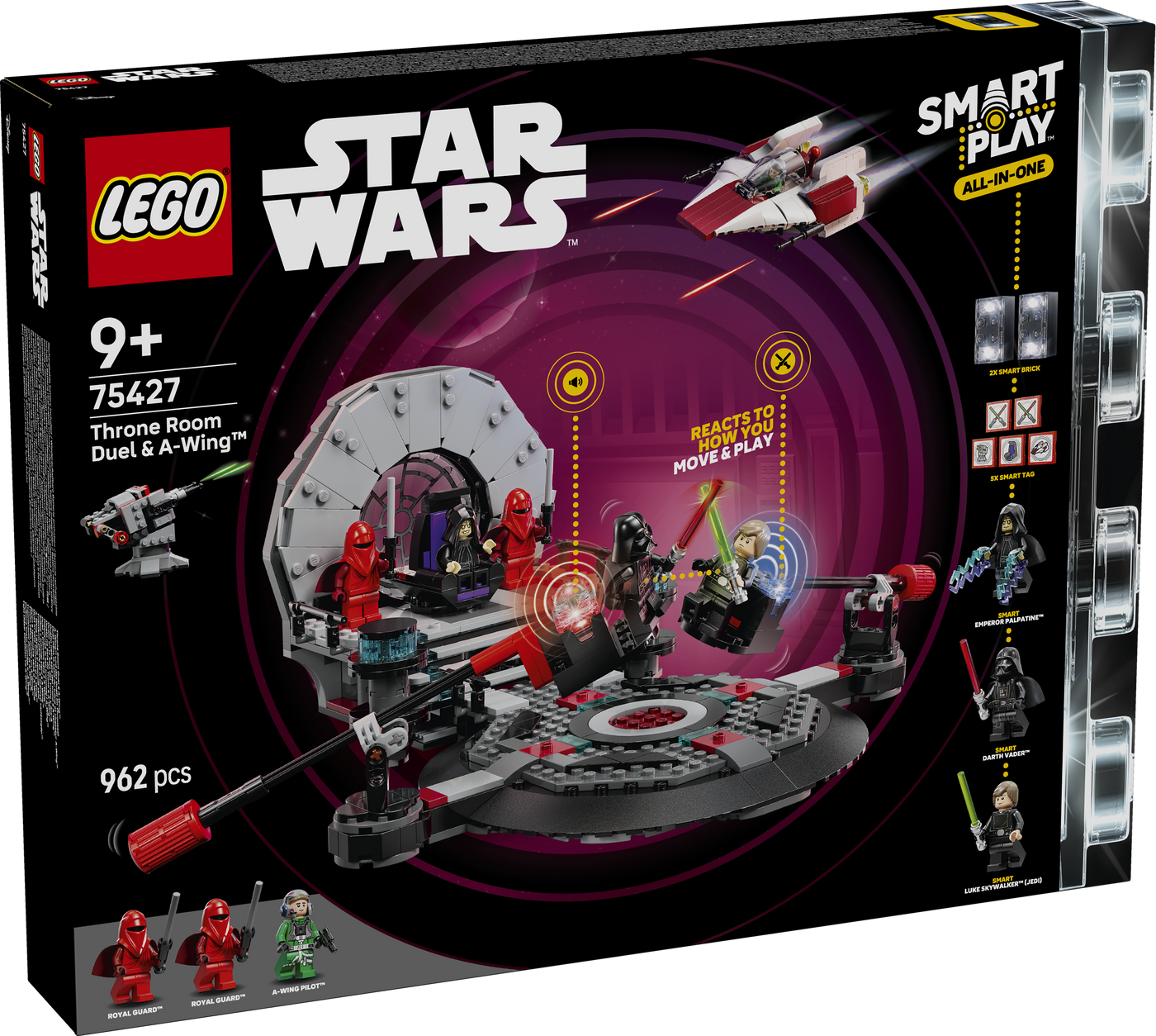 Play out an immersive throne room duel and A-wing attack on the Death Star with this LEGO® Star Wars™ interactive building toy (75427) for kids. Part of a range of sets powered by the LEGO SMART Play™ system, this All-In-One Set includes all SMARTPlay components – 2 SMART Bricks and charger, 3 LEGO SMART minifigures and 5 SMART Tags – enabling responsive play, dynamic sounds and lights, and more. Listen to “The Imperial March” playing as SMART Emperor Palpatine sits on his throne. Hear Lightsab ers™ hum as SMART Luke Skywalker and SMART Darth Vader duel and the A-wing’s engines roar in flight. Activate the A-wing’s laser shooters and dodge the Death Star turret’s lasers. Help children get started, troubleshoot, control sound levels and download updates for enhanced SMART Play action with the LEGO SMART Assist App. A top LEGO Star Wars gift for boys and girls ages 9 and up, this set contains 962 pieces.