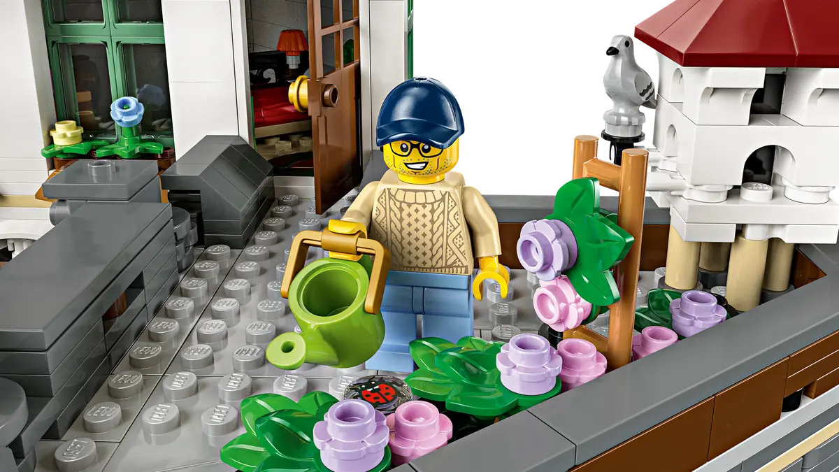 The 3-level building includes a 2-storey music shop with marching-band instruments, and an adjacent furniture shop complete with a counter, stools, table and workshop. The top floor is home to a furnished flat with a bathroom, while a roof garden provides space for potted plants and a pigeon coop. Perfect for home office decor, this model includes 7 minifigures and a modular design with easy access to the interior.