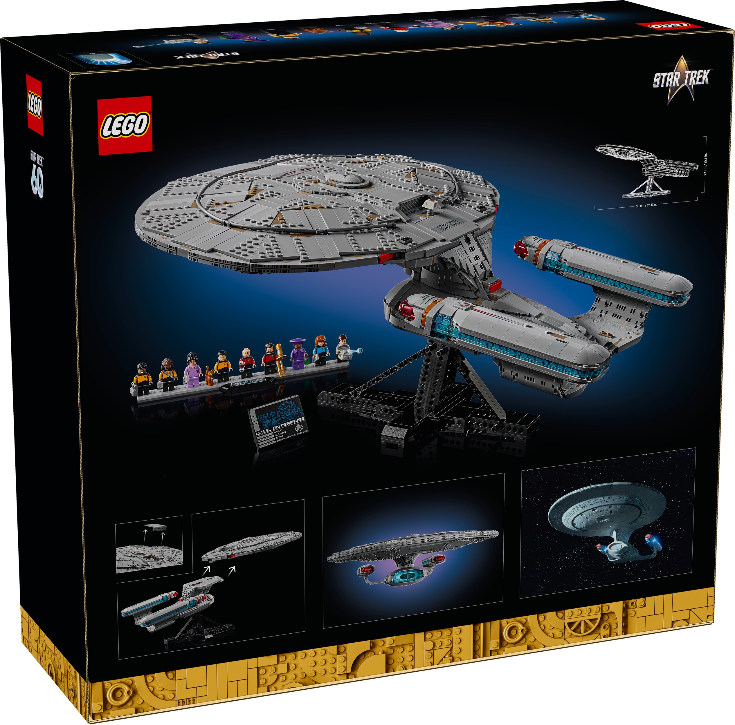 • Dimensions – The U.S.S. Enterprise starship model, including its display stand, in this 3,600-piece construction set measures over 27 cm (10.5 in.) high, 60 cm (23.5 in.) long and 48 cm (18.5 in.) wide