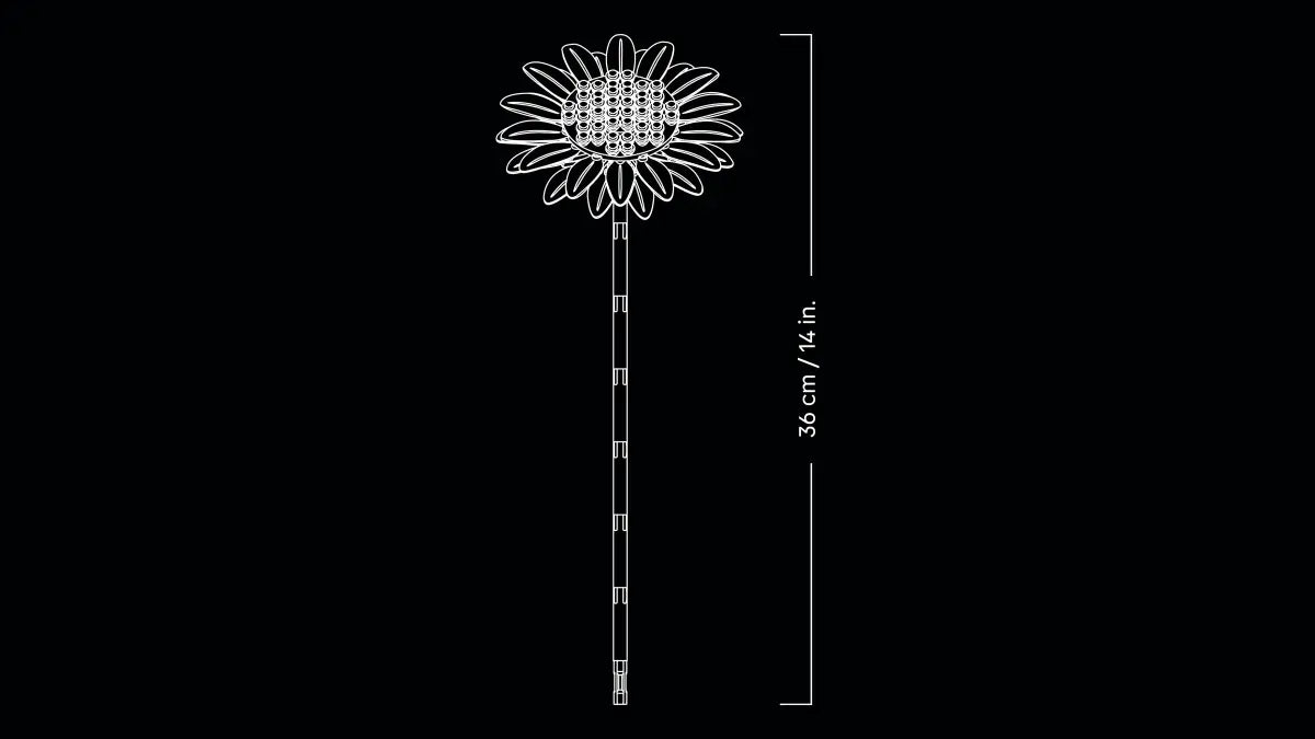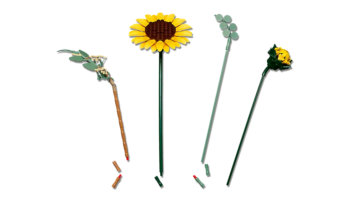 - LEGO® SUNFLOWERS – The bouquet includes 6 sunflowers in various stages: 1 sunflower bud, 3 sunflowers beginning to bloom and 2 big fully opened sunflowers