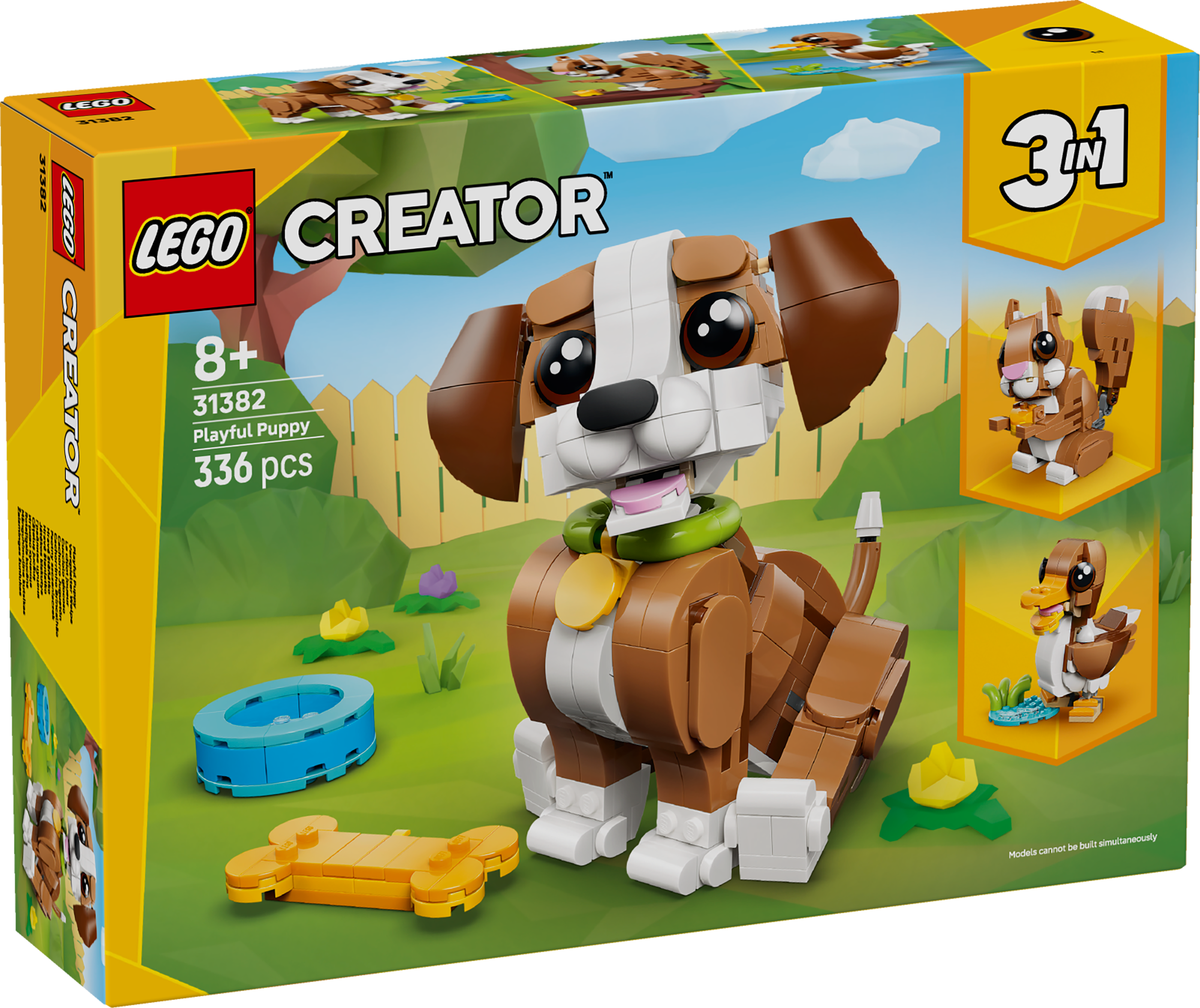 LEGO® Creator 3 in 1 Cute Animals: Playful Puppy Dog (31382) building set lets kids ages 8 and up play out fun-filled stories. This cute animal toy for girls and boys offers 3 different building options with the same set of bricks. Kids can chooseto build a toy dog with a posable head, ears, legs, tail, brows and mouth, which comes with a collar, toy bone and a water bowl. This can be rebuilt into a squirrel toy with a posable head and tail holding an acorn, or a duck model with a posable head and a greenery-filled pond. Once playtime is over, each model can be proudly displayed. This 3 in 1 animal set will inspire kids’ imaginations and makes a cute gift for girls and boys who love pretend play. Kids can build each playset with confidence using the LEGO Builder app – zoom, rotate in 3D and track progress with easy-to-follow digital instructions. Please note models cannot be built simultaneously. Set contains 336 pieces.