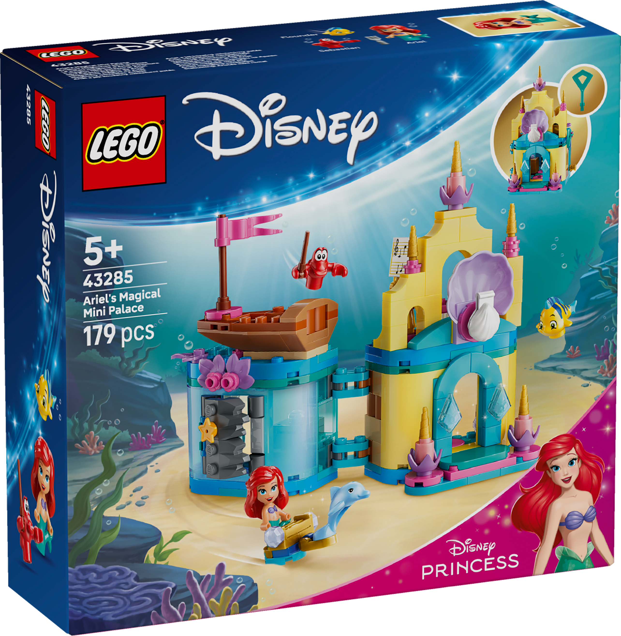 - DISNEY’S THE LITTLE MERMAID TOY BUILDING SET – Ariel’s Magical Mini Palace (43285) features Ariel, Flounder and Sebastian LEGO® ǀ Disney characters, a small boat and a lockable mini-palace and grotto