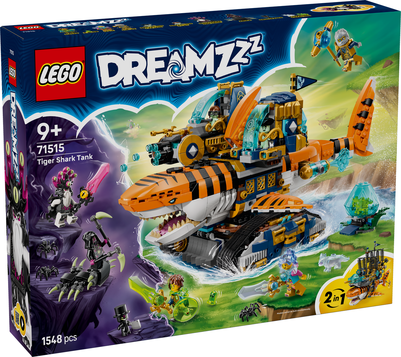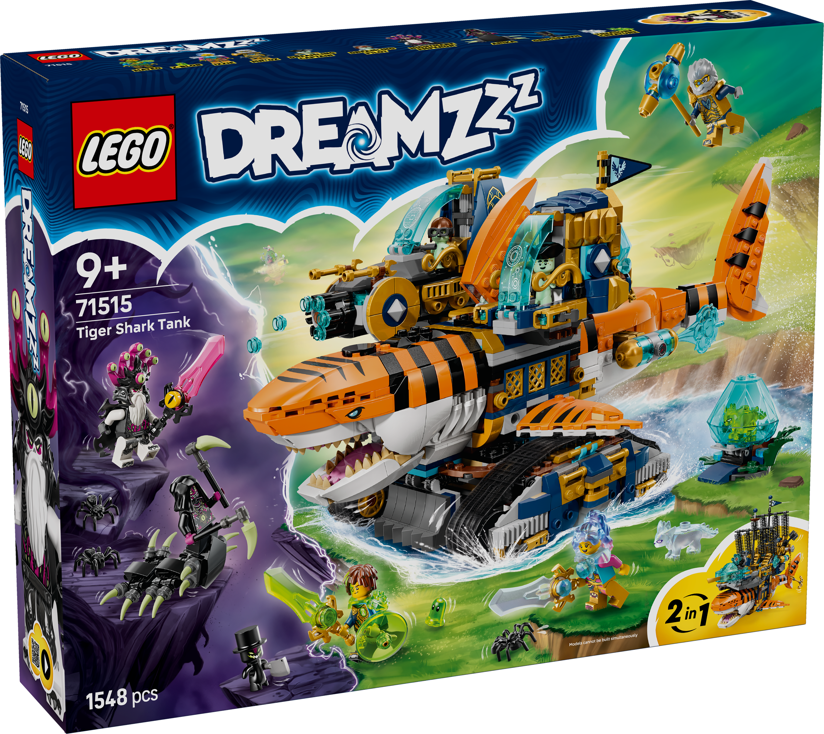 Ignite imaginations with the LEGO® DREAMZzz™ Tiger Shark Tank (71515) building set for boys and girls ages 9 and up. The set offers 2 build options, so kids can create a tiger shark tank toy or tiger shark ship toy. The tiger shark tank has an opening mouth, movable tail and 2 side pods with shooters, storage and room for a minifigure pilot, while the tiger shark ship has a front cannon, side shooters, an opening mouth, treasure storage in the back and an anchor accessory. Mateo, Izzie, Mr. Oz, the Nightmare Emperor and Arika minifigures encourage pretend play and have collectible sword accessories. There's also a diamond egg, plus Green and White Treasure Creatures, Z-Blob, a Grimspawn, 2 dreamling figures and 3 spiders. A birthday giftfor boys and girls, the shark toy features story-led building instructions that bring the action to life and encourage kids to immerse themselves in the story. These are also available digitally in the LEGO Builder app. Set contains 1,548 pieces.