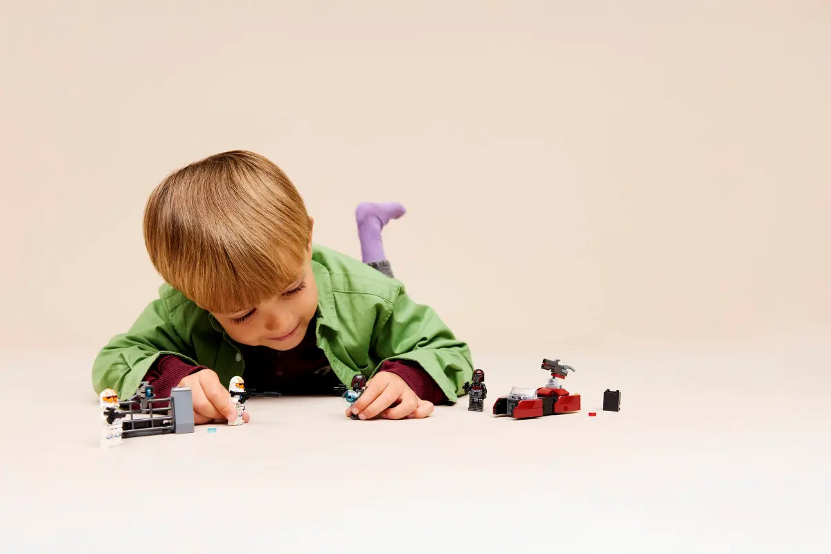 Treat kids to an awesome Battle Pack (75449) to play out their own version of the Siege of Mandalore from Star Wars: The Clone Wars™. This toy building set features 4 LEGO® Star Wars™ minifigures – 2 Mandalorian Super Commandos and 2 Ahsoka versions of 332nd Clone Troopers, a Mandalorian speeder, the Clone Troopers’ barricade and lots of accessories for action-packed play. Activate the speeder’s stud-shooting blaster and fire back with the stud shooter mounted on the barricade. Strap on the Commandos’ jetpacks for aerial attacks with their blaster pistols. This building toy has so much to inspire kids’ imaginations and makes a fantastic small gift for boys, girls and any Star Wars fans ages 6 years old and up. And look out for other Battle Pack sets (sold separately) in the range to add even more play possibilities. Kids can build with confidence using the LEGO® Builder app – zoom, rotate in 3D and track progress with easy-to-follow digital instructions. Set contains 116 pieces.