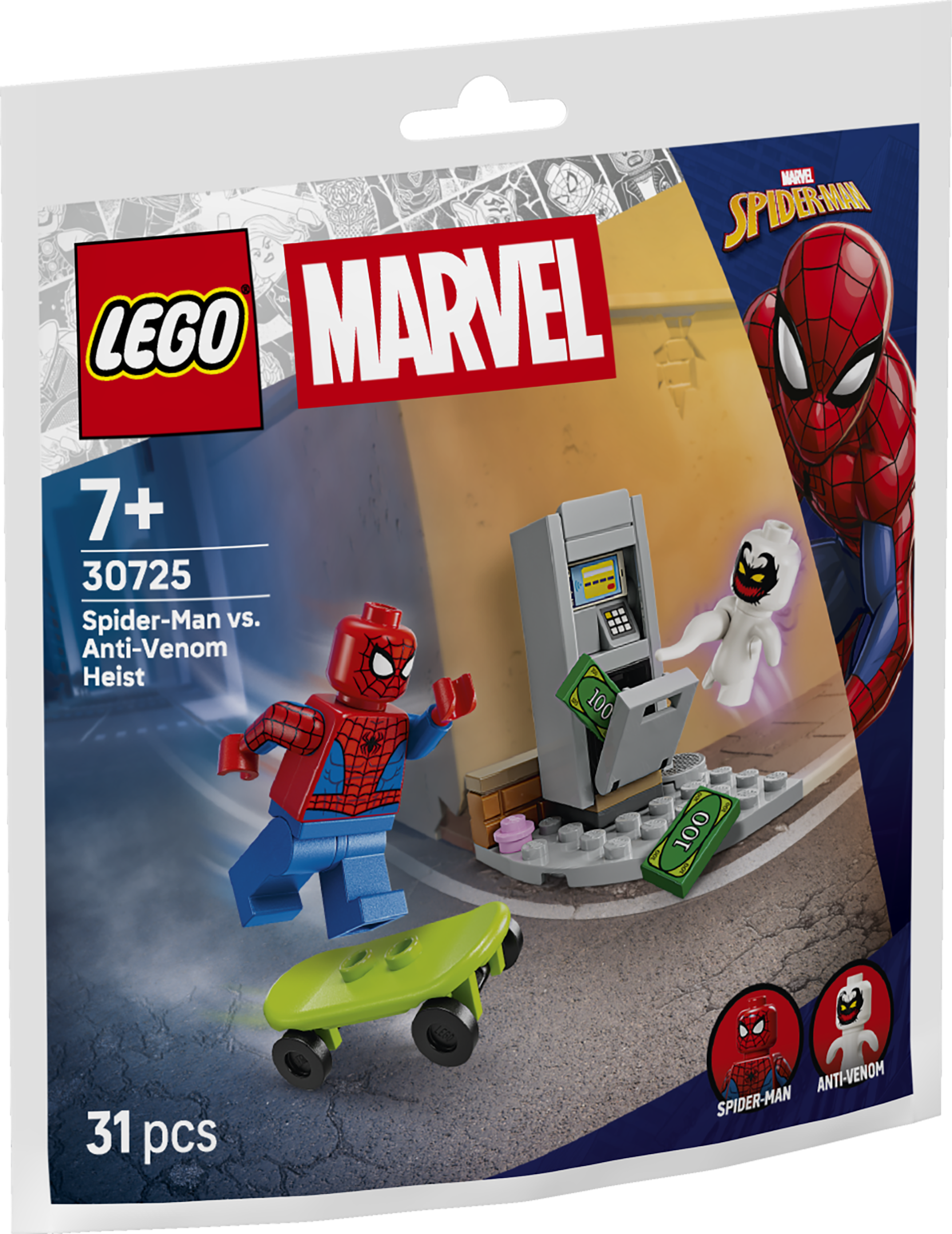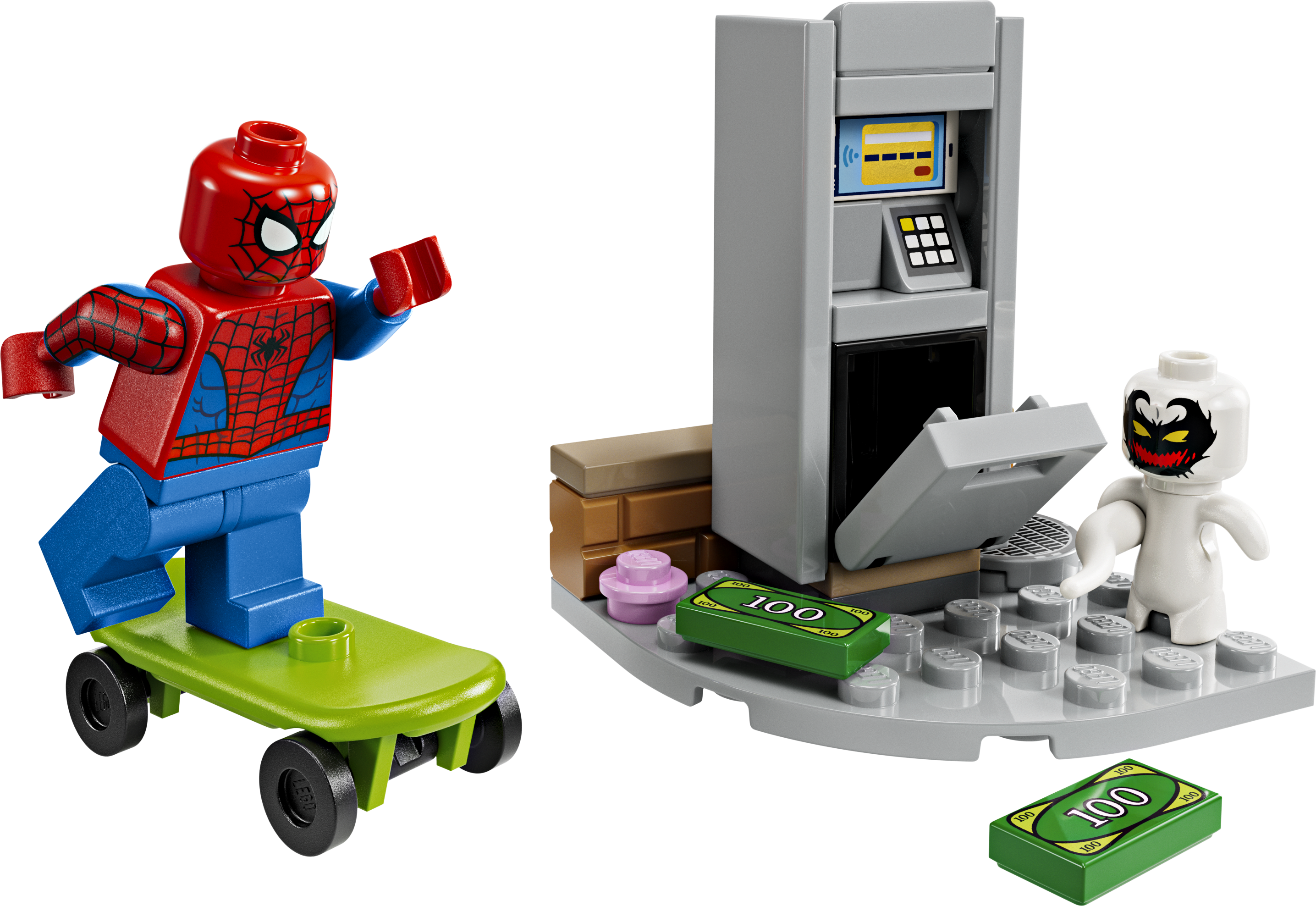 Anti-Venom breaks open a street-corner cash machine and steals the money stored inside. Spider-Man sees the villain running away and chases after him on a skateboard.